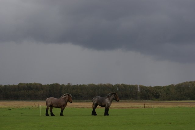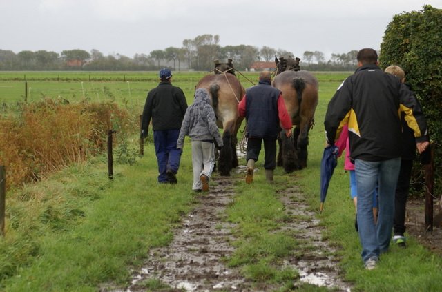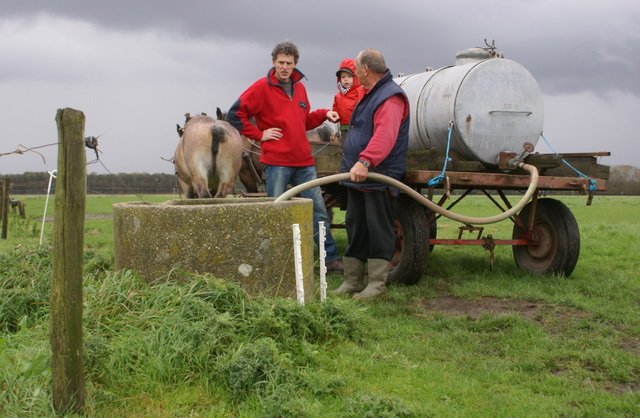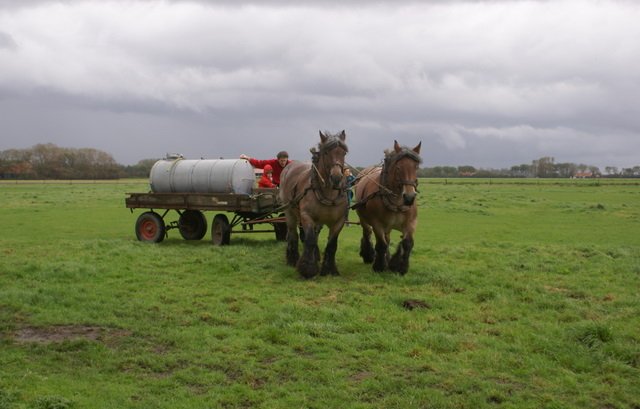En Adri had uiteraard ook voor de werkzaamheden op deze dag een alternatief programma voorhanden: met de sleepeg verspreidde hij de opgehoopte mest van de paarden over het weiland en met de wagen en watertank voegde hij nog meer water toe aan de drinkbakken van de paarden. Uiteraard werd dit alles uitgevoerd met de trekkracht van zijn Zeeuwse trekpaarden. Kijkt u voor een beeldverslag naar de foto's in het volgende album.